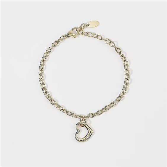 Bracciale in acciaio 316L e PVD giallo con catena forzatina 4 mm, ciondolo cuore 14x12.5 mm e cristalli Ø 1.25 mm lunghezza regolabile da 16 a 19 cm