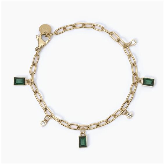 Bracciale in acciaio 316L con catena forzatina allungata 3 mm, con pendenti smeraldo sintetico 6x4 mm e cristalli Ø 2.5 mm, lunghezza regolabile da 16 a 19 cm