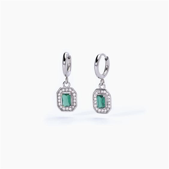 Orecchini in acciaio 316L con ciondolo smeraldo sintetico 6x4 mm e cristalli Ø 1.25 mm. Diametro esterno cerchio 14 mm, lunghezza totale orecchino 3 cm.