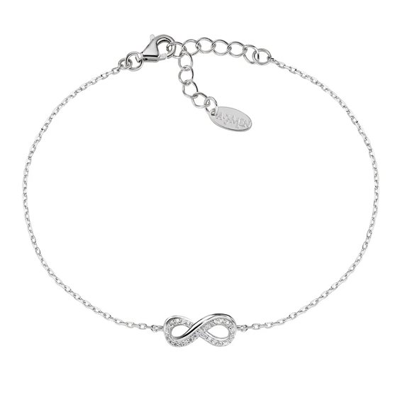 Bracciale in argento 925 rodiato con charm infinito a doppia lavorazione liscia e con zirconi bianchi. Dimensioni del charm infinito: 15 x 7 mm. Lunghezza del bracciale regolabile da 16 a 19 cm con chiusura a moschettone e catenina di allungo.