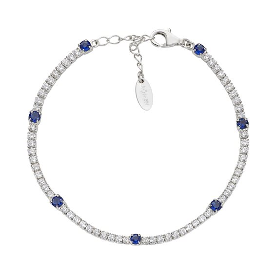 Bracciale tennis in argento 925 rodiato con zirconi bianchi da 2 mm intervallati da zirconi blu da 3 mm. Lunghezza regolabile da 16 a 19 cm con catenina di allungo e chiusura a moschettone.