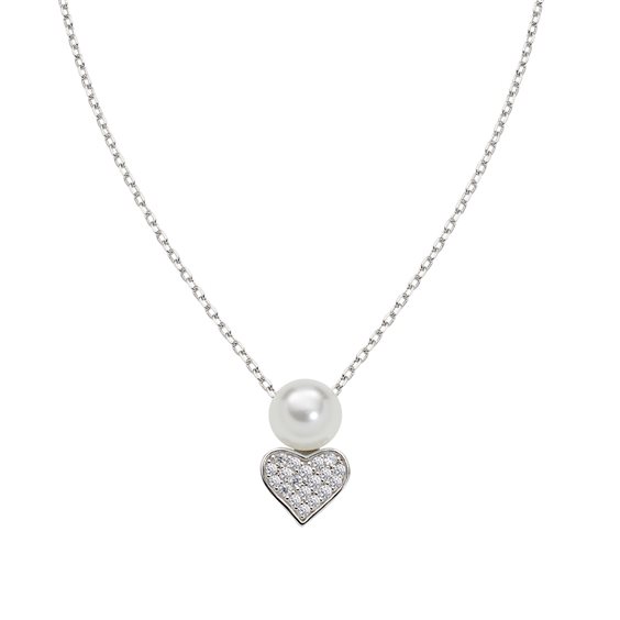 Collana in argento 925 rodiato, pendente con perla da 8 mm e cuore con pavé di zirconi bianchi. In totale, il charm è lungo 1,8 cm, mentre la collana ha lunghezza regolabile da 40 a 45 cm con chiusura a moschettone e catenina di allungo.