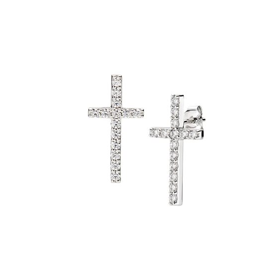 Orecchini a croce in argento 925 rodiato con zirconi bianchi. Altezza 2 cm, larghezza 1 cm. Chiusura a farfallina.