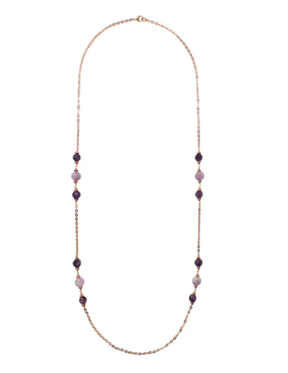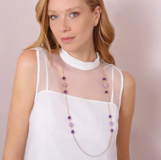 Collana lunga Bronzallure realizzata su base Golden Rosé, placcata oro rosa 18kt, con catena rolo impreziosita da otto sfere sfaccettate (10 mm) in ametista viola e quattro sfere lisce (12 mm) in ametista lavanda; chiusura a moschettone. Ogni pietra presenta ai lati due piccole rondelle in golden rosé. Lega brevettata Golden Rosé Designed and made in Italy Pietre naturali selezionate Nickel free, cadmium free Ipoallergenica Materiale: Golden rose Lunghezza (cm): 98 Peso (g): 39.4