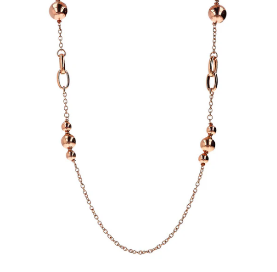 Collana lunga Bronzallure realizzata in lega Golden Rosé, placcata Oro rosa 18kt, con catena rolo impreziosita da station di maglie ovali intrecciate (16x10 mm) alternate a bead lucide piccole (8 mm), medie (12 mm) e grandi (14.5 mm). Lunghezza 94 cm. Chiusura a moschettone. Lega brevettata Golden Rosé Designed and made in Italy Nickel free, cadmium free Ipoallergenica Materiale: Golden rose Lunghezza (cm): 94 Peso (g): 43.1