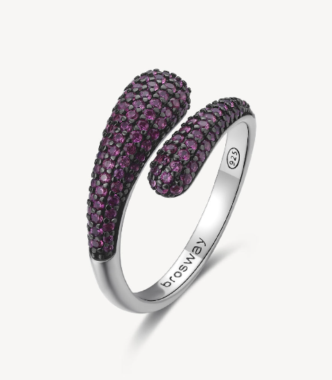 Anello contrarié in argento rodiato 925‰ con galvanica colore rutenio e cubic zirconia colore ruby.