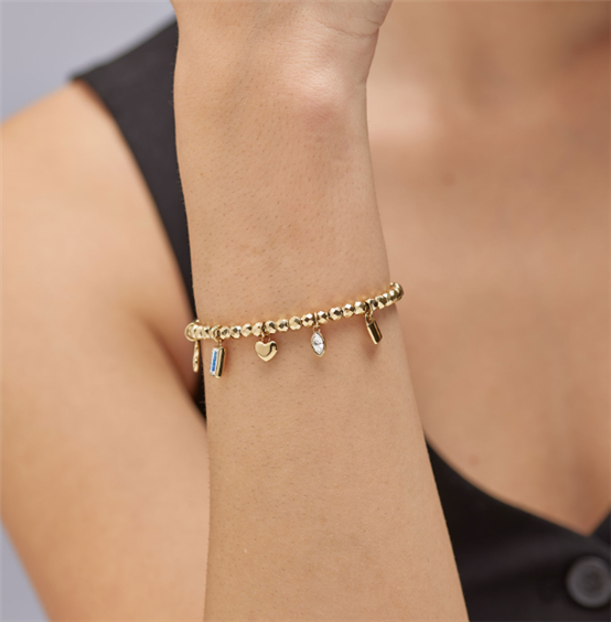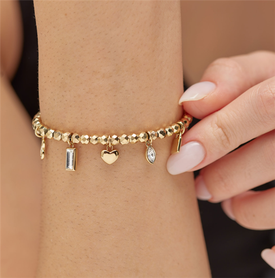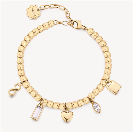 AMORE, ISTINTO, SOGNO Segui il tuo cuore e ne conoscerai il valore. Il mondo diventerà affascinante e le scoperte continue, anche nelle situazioni più ordinarie. Scegli di essere qualunque cosa tu voglia. Bracciale con sfere in acciaio 316L, finitura pvd oro 14K e pendenti con infinito, cuore, lucchetto e cristalli.