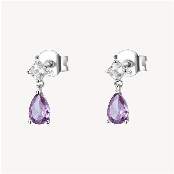 Orecchini pendenti in argento rodiato 925‰ con square cubic zirconia e pear cubic zirconia colore amethyst.