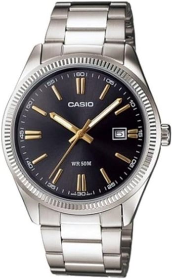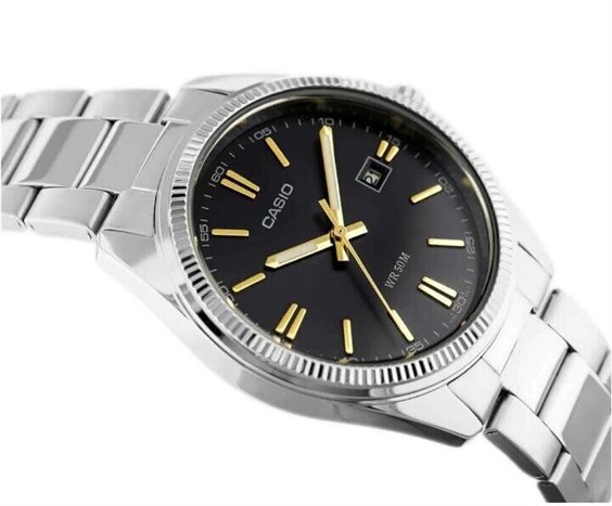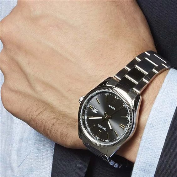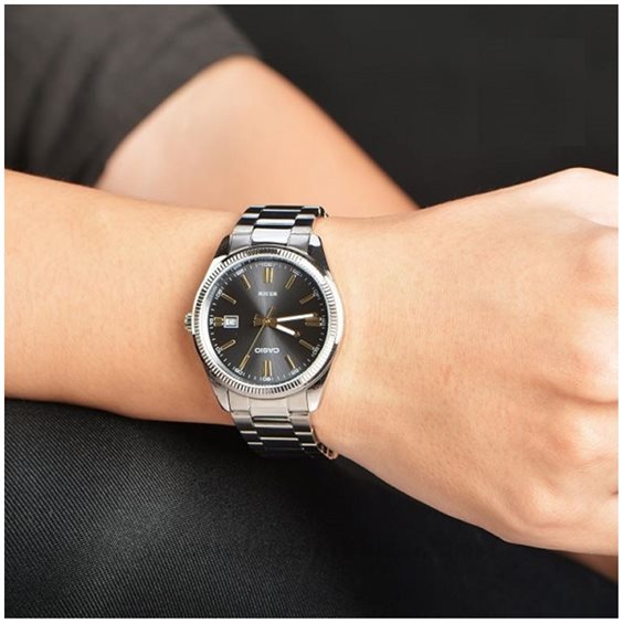Orologio solo tempo Casio, cassa in acciaio del diametro di 40 millimetri e quadrante nero, cinturino in acciaio con fibbia e logo inciso, resistenza all'acqua 5 atm.