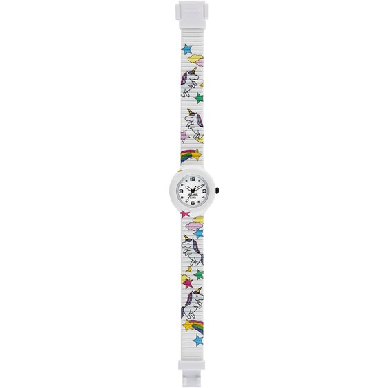 Cinturino stampato con la tecnica 'water transfer' a tema unicorni, con numeri arabi agli indici per imparare a leggere le ore. Cassa 28 mm, Movimento 3H Miyota 2035, sfere con Luminous.