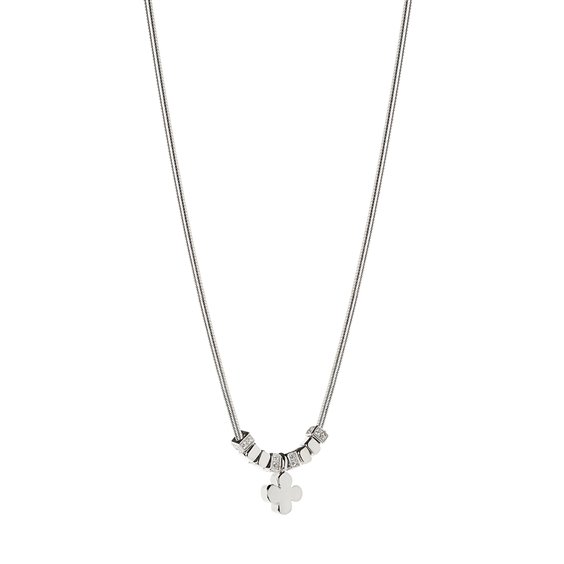Collana, pepite squadrate con zirconi e lisce, charm Quadrifoglio 3D. Lunghezza 37-45 cm.chiusura con moschettone regolabile.