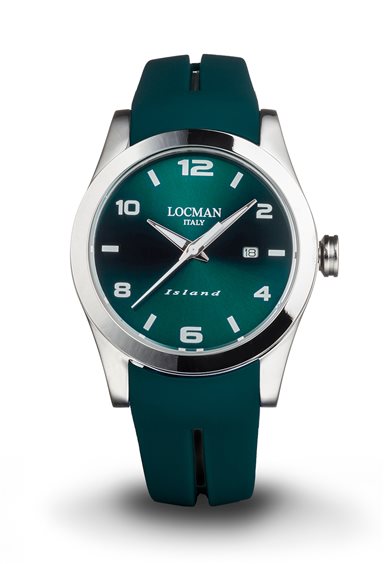 ISLAND ACCIAIO SOLO TEMPO, CON FONDELLO IN TITANIO, E CINTURINO IN SILICONE. CASSA COLORE ACCIAIO, QUADRANTE E CINTURINO COLORE PETROLIO.