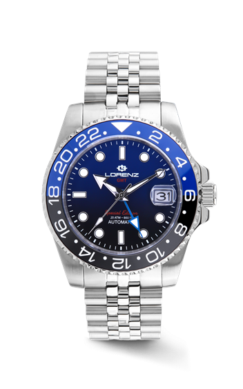 Questo orologio rappresenta l’ultima evoluzione dei modelli GMT di Lorenz. La cassa, realizzata in acciaio 316L con finitura lucida e satinata, ha un diametro di 40 mm. Il fondello trasparente a vite consente di ammirare il movimento Seiko NH34, caratterizzato da una massa oscillante personalizzata nel colore. La lunetta unidirezionale a 120 scatti è realizzata in ceramica solida, mentre il bracciale jubilée con finitura lucida e satinata si abbina perfettamente al quadrante particolare, con un effetto degradé in due tonalità, conferendo al segnatempo un aspetto sportivo e distintivo. Con un’impermeabilità fino a 200 metri, questo orologio è il compagno ideale per le vostre avventure, che si tratti di un viaggio o della vita quotidiana.