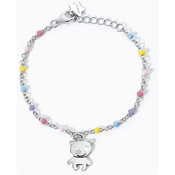 Bracciale di Mabina Gioielli da bambino della collezione Hug Me. Bracciale in argento rodiato con ciondolo orsetto e inserti catena smalto multicolore. Lunghezza regolabile da 14.5 a 16.5 cm. La referenza è: 533612