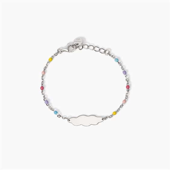 Bracciale personalizzabile in argento rodiato con catena forzatina e inserti multicolor. Piastra centrale a forma di nuvoletta.