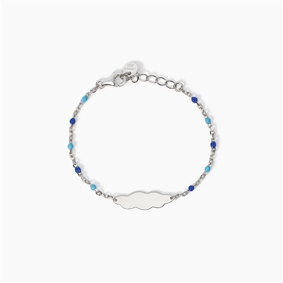 Bracciale personalizzabile in argento rodiato con catena forzatina e inserti multicolor smaltati blu. Piastra centrale a forma di nuvoletta.