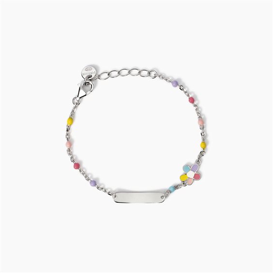 Bracciale personalizzabile in argento rodiato con catena forzatina, elemento fiore e inserti multicolor smaltati.