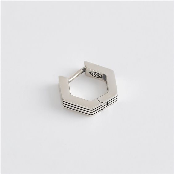 Orecchino esagonale allungato in argento brunito con finitura rigata. • Dimensione dell'orecchino: 14 x 12 mm • Misura unica • Materiale: Argento 925
