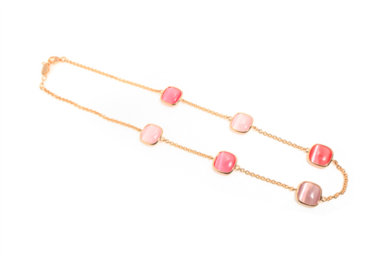 Gioiello della collezione Laguna. Girocollo in argento rosè con quarzi idrotermali color ciliegia, rosa e lilla. Collezione Laguna