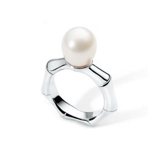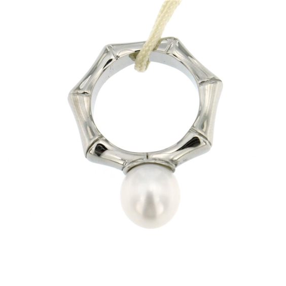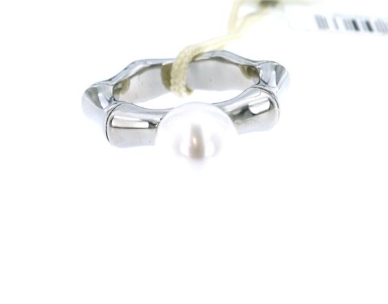 Anello con perla centrale e gambo formato da piccoli segmenti che ricordano il bambù.
