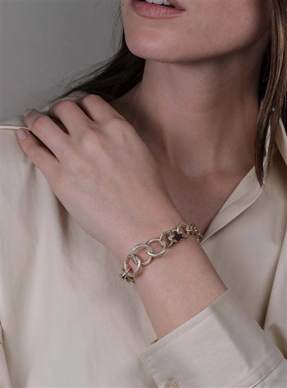 Bracciale con maglie tonde diamantate, chiusura a moschettone. Lega leggera anallergica placcata in oro 24KT.