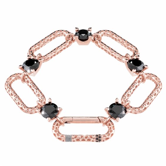 Bracciale Jolie a catena maglia grande e pietre nere in argento placcato oro a lavorazione traforata con dettaglio di polvere di diamanti e pietre nere. Lunghezza 18 cm circa.