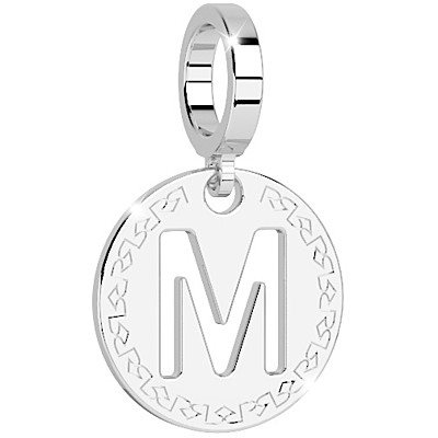 Charm in bronzo rodiato di forma circolare con lettera dell'alfabeto traforata incorniciata da una greca incisa e logo Rebecca. Un cordino in cotone cerato di colore nero per questo charm è incluso nel prezzo: acquista la tua lettera e lo riceverai in regalo.