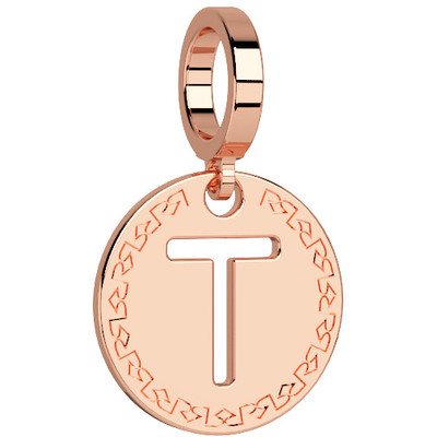 Charm in bronzo laminato oro rosa di forma circolare con lettera dell'alfabeto traforata incorniciata da una greca incisa e logo Rebecca.