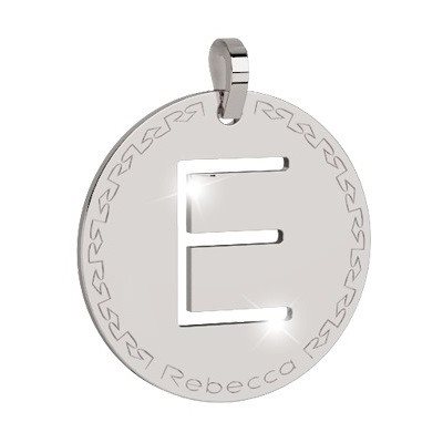 Charm in bronzo rodiato anallergico, al cui centro è presente una lettera incorniciata circolarmente da un motivo a greca con il logo Rebecca. La collana per questo charm è inclusa nel prezzo: acquista la tua lettera e la riceverai in regalo.