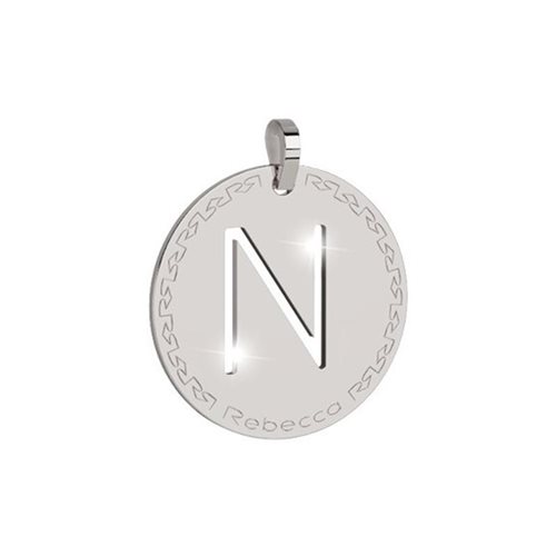Charm in bronzo rodiato anallergico, al cui centro è presente una lettera incorniciata circolarmente da un motivo a greca con il logo Rebecca.