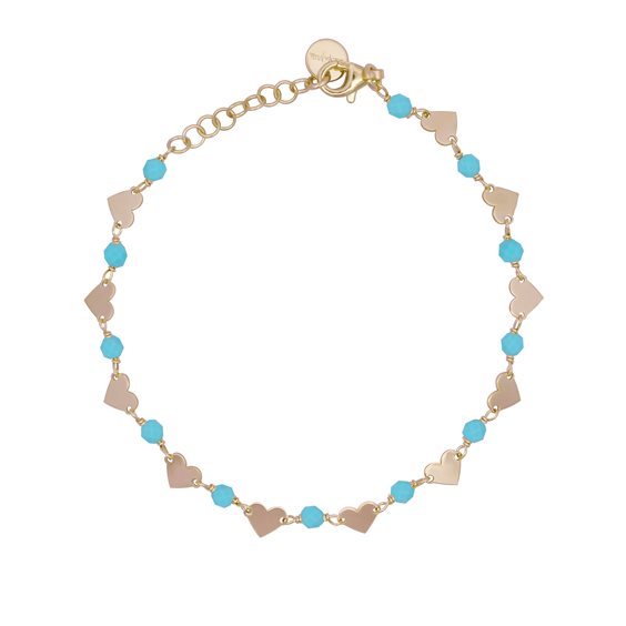 Braccialetto incatenato con cuori intervallati da pietre color turchese La misura è idonea per un polso da adulto. Colore: Turchese Misura: 16 cm + 2 cm estensione Finitura disponibile: Placcatura oro giallo Materiale: Argento 925